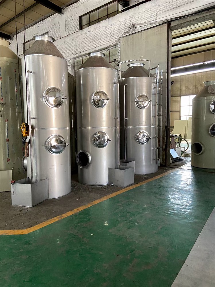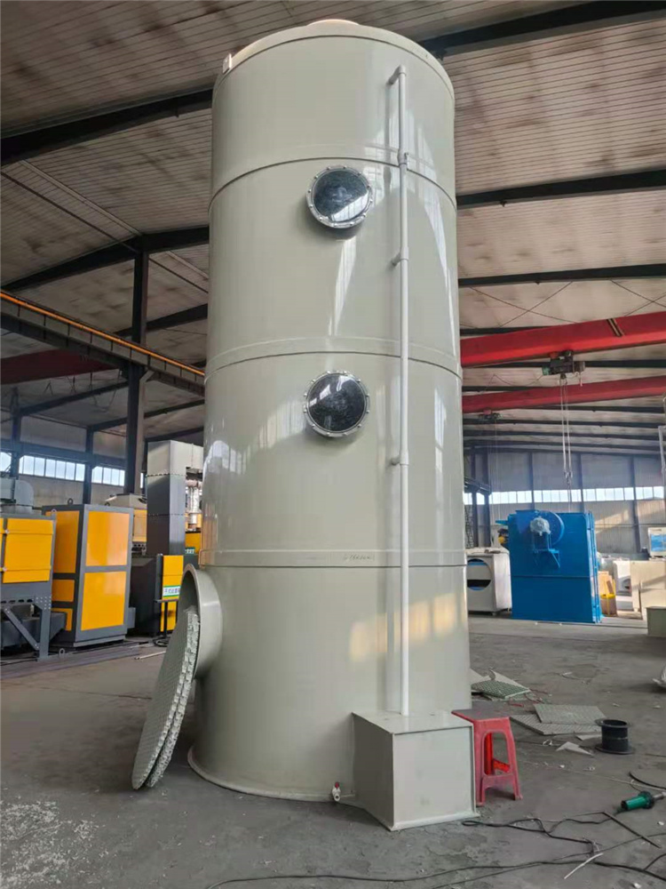 喷淋塔由塔体、填料、液体分布器、气水分离器、喷淋系统、循环水泵、循环水池、药液储存投加系统等单元组成。