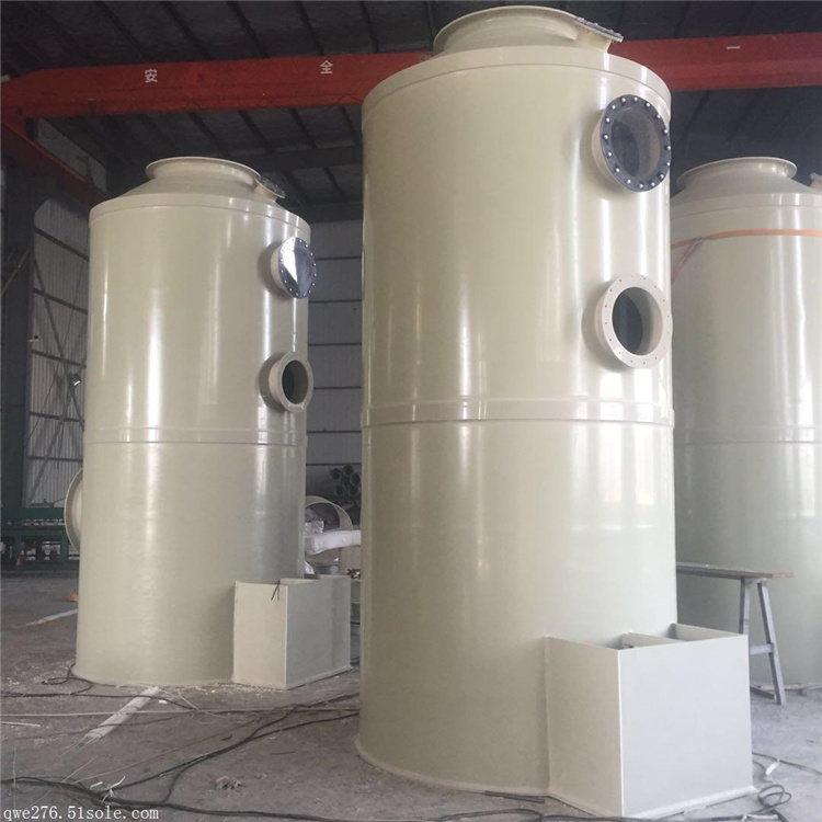 湿式喷淋洗涤塔构造与原理:使废气与水或者添加化学药剂之水溶液接触,将污染物传入水中,充填填料造成相当大的接触面提供气相于液相酸碱中和,从而达到废气净化的目的。